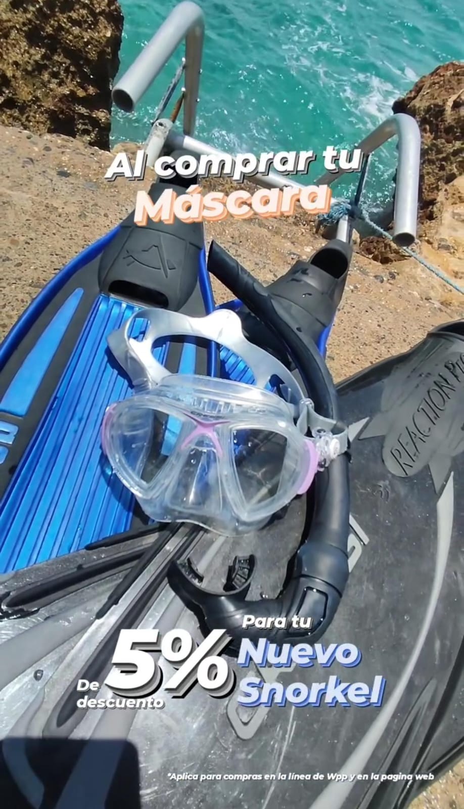 Por tu compra de caretas, llévate tu snorkel con un 5% de descuento final, aplicado en la pantalla de pagos.