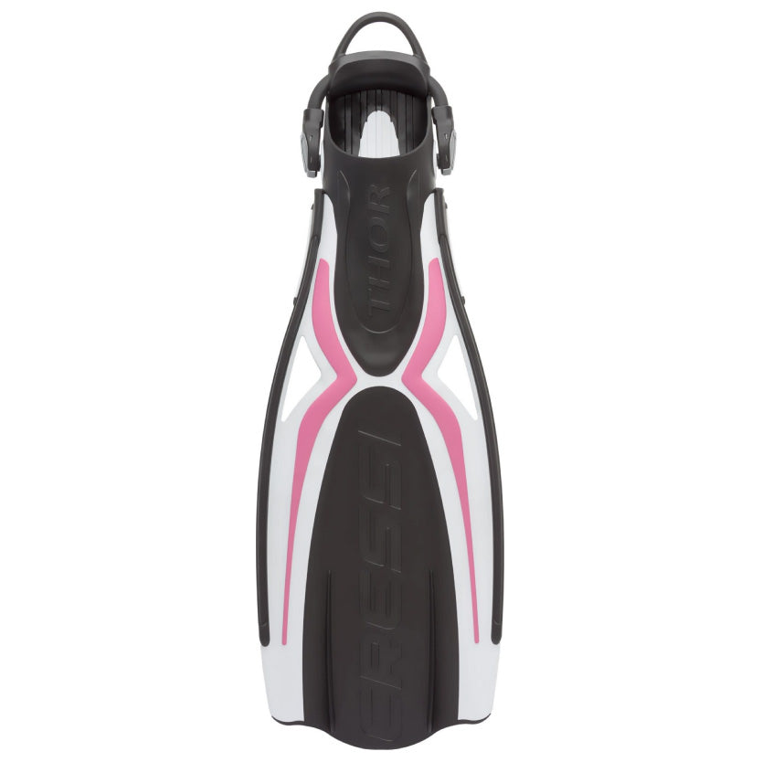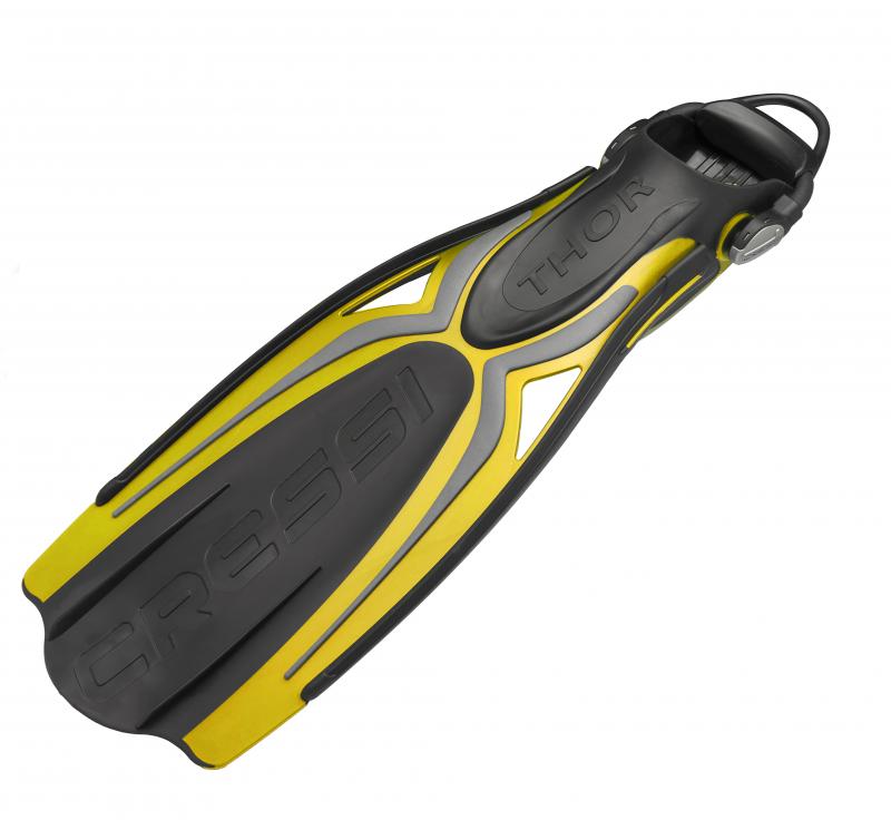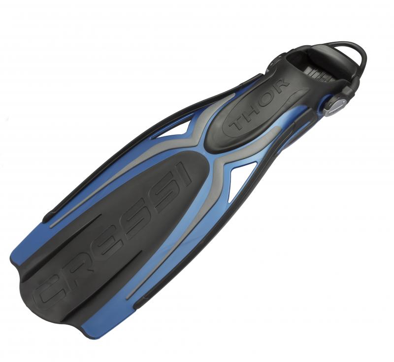 Innovative structure combining two central ribs in high modulus polypropylene and a central area of the blade in convex section thermoplastic rubber, assembled in a polypropylene blade | Two side nozzles for discharging the associated negative forces | Channeling and acceleration of water flow, which stabilises and increases propulsion in relation to effort | Blade inclination increased by 5% for greater flapping effectiveness | Medium stiffness | Excellent balance between power and flapping comfort | EBS buckle system with natural latex strap: maximum comfort and energy transmission.
