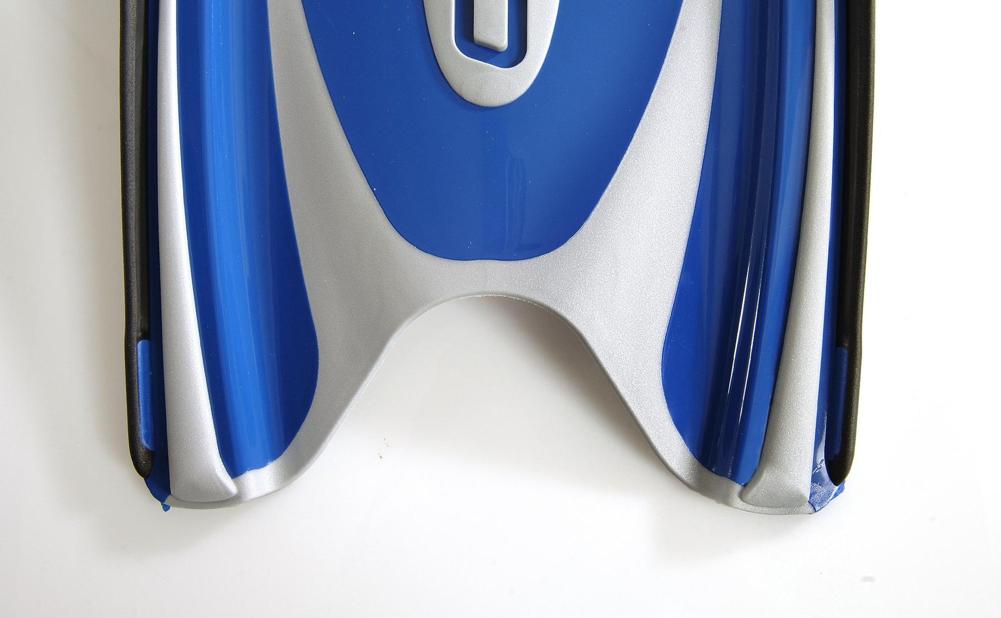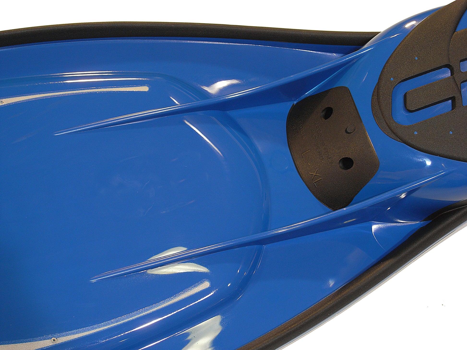 - Diseño "calzante bajo la pala": la pala nace directamente de la parte superior del calzante, uniendo sólidamente la aleta al pie y transmitiendo todo el esfuerzo generado al aletear sin pérdidas de energía a través de zonas blandas. Este formato permite canalizar el agua desde el mismo tobillo hasta el borde final de la pala, a diferencia de los modelos tradicionales, en los que el calzante no tiene aportación alguna sobre el avance. Además de mejor la direccionalidad del aleteo, este diseño proporciona unas prestaciones entre un 10% y un 15% superiores a las que las correspondería a la aleta por su superficie de pala.