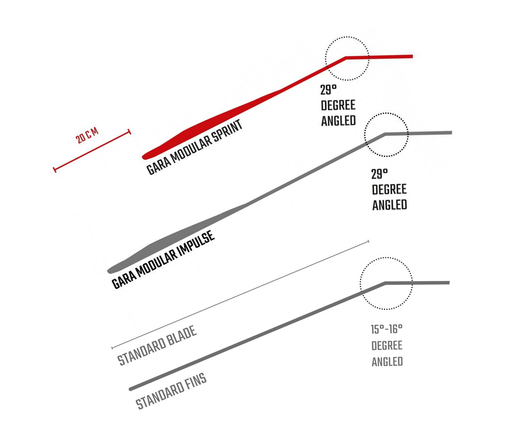 Pala con angulación de 29º contra los 15 a 21º tradicionales. Esta angulación permite un aleteo con el pie en posición completamente relajada sin apenas forzar empeine y gemelos para alinear la pala con la pierna. Esto hace que el aleteo sea suave y confortable pero altamente efectivo, tanto para desplazamientos por superficie como para vencer situaciones de gran resistencia al avance como el ascenso desde el fondo, mar fuerte o el inicio del descenso con lastre ajustado.