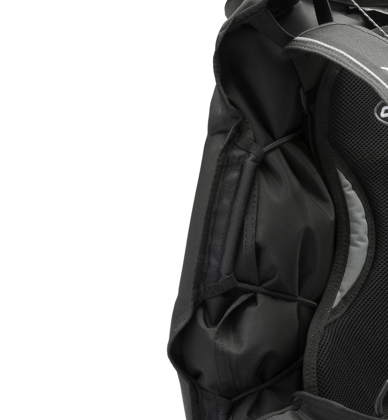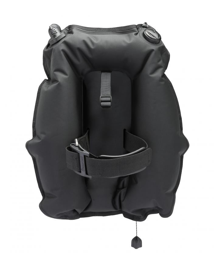 Dorsal air chamber with a high lifting capacity (19 kg size M) but with a always contained external stowage volume, thanks to the elastic containment tensioners that have the additional mission of facilitating the emptying maneuver and preventing air displacement during immersion that would cause instability.