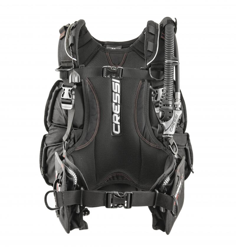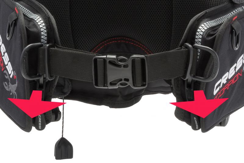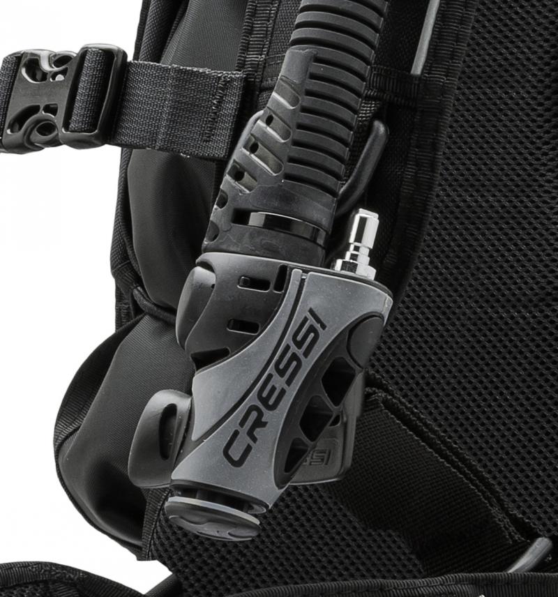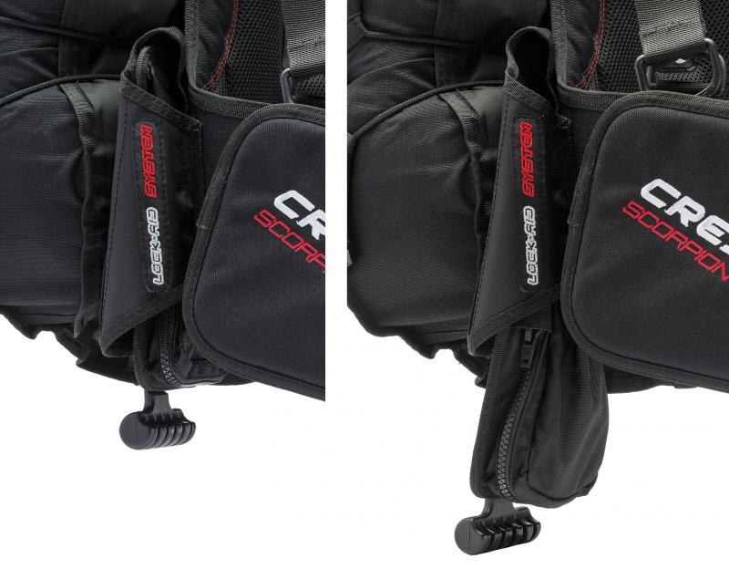 LAS ballast system (Lock Aid System)2.0 vertical, The system is located in line with the bottle behind the pockets and perfectly integrated into the profile of the vest. This system, following the Cressi tradition, guarantees maximum ease of insertion and removal of the ballast with total safety against accidental loss since its anchors incorporate a spring (patented) to prevent accidental snagging.