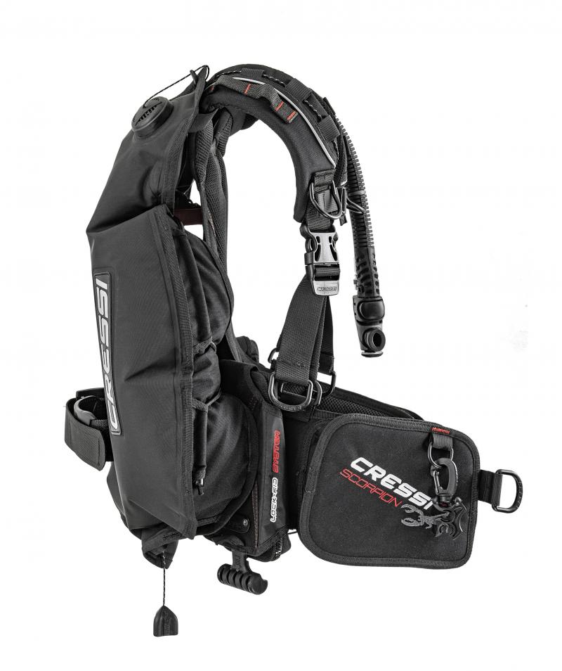 SCORPION It is a 100% dorsal volume vest, versatile for all types of diving, with a robust but lightweight construction at the same time (2.5 kg size M) and with a small carrying volume but robust and very flexible.
